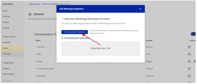 From the left-hand navigation column navigate to your organization, then go to Channels and click on the WhatsApp link. A new window will open.