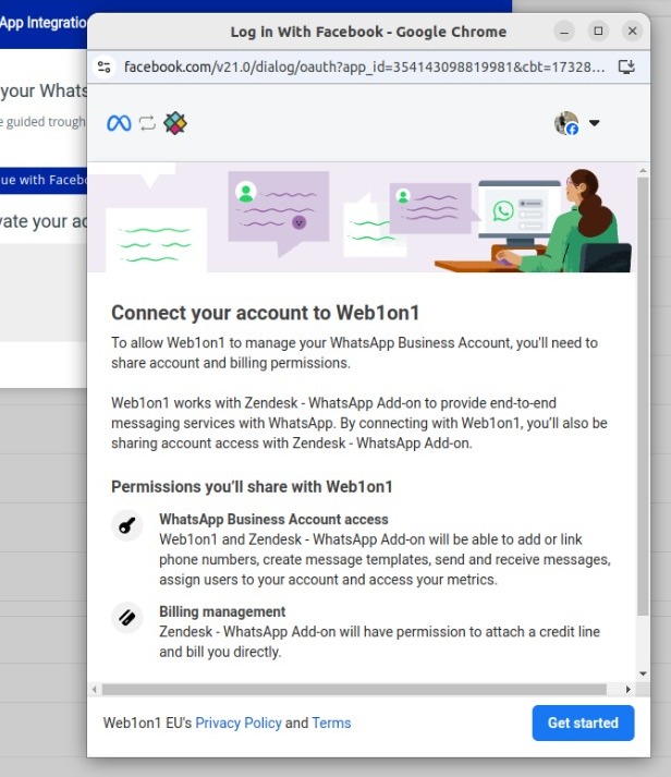 Step 3: Facebook will then ask you to allow Web1on1/Zendesk (Zendesk is our partner) to manage your WhatsApp Business Account. Click Get started to proceed.