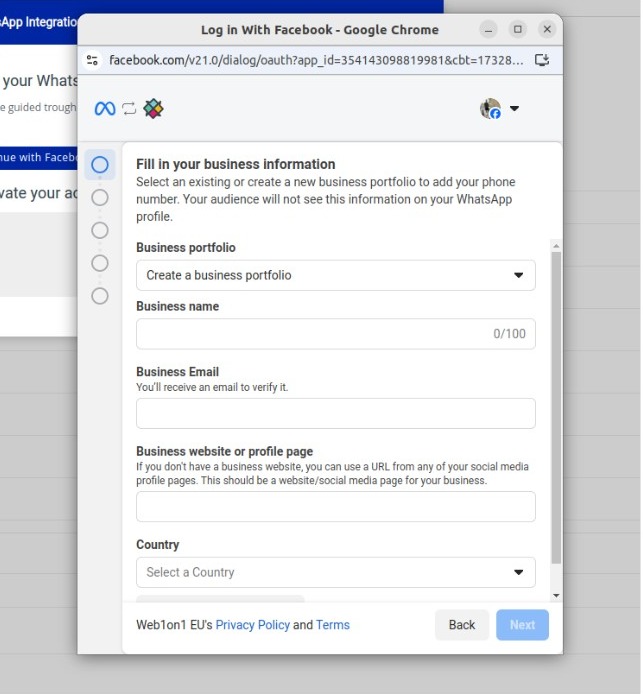 - WhatsApp Business Account Name - this is only used for internal purposes and is not consumer facing. If you had selected a WABA on the previous screen, you will not be able to change the name here.