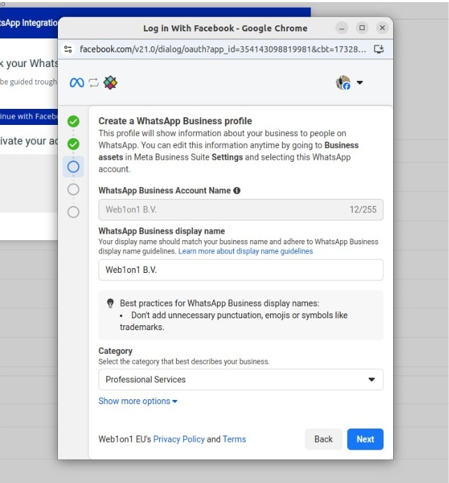 - WhatsApp Business display name - this is what your customers will see. It MUST meet the requirements set by WhatsApp