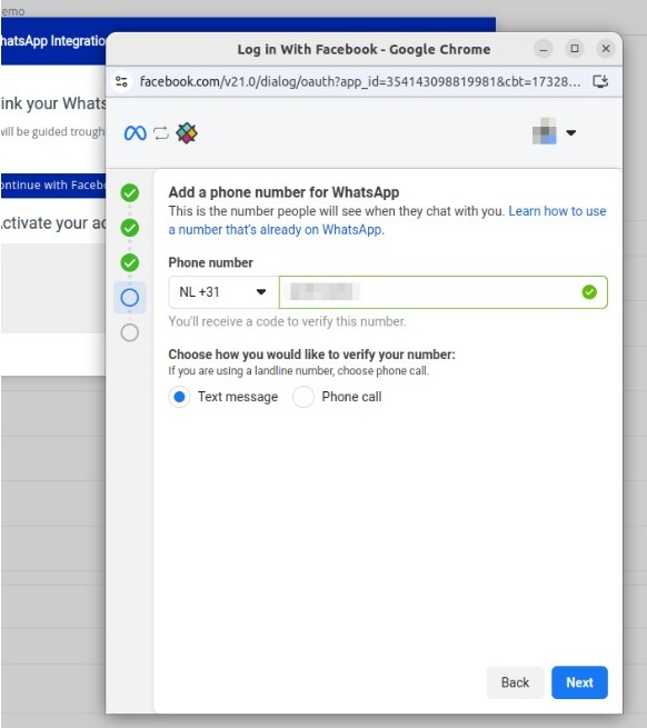 This is done by sending a verification code using either SMS or an automated voice call. Follow the instructions below based on the type of phone number you are using for your WhatsApp integration: