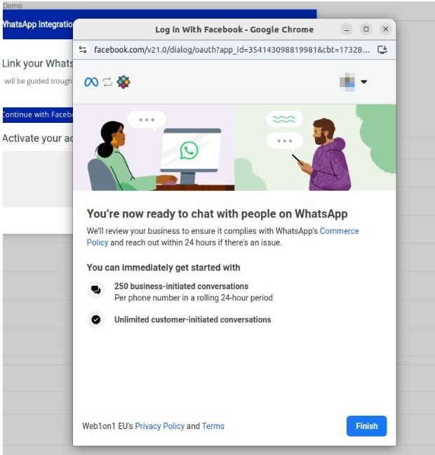 Step 8: Once your phone number is verified by Meta, you may continue to click Next/Finish until the pop-up window closes.