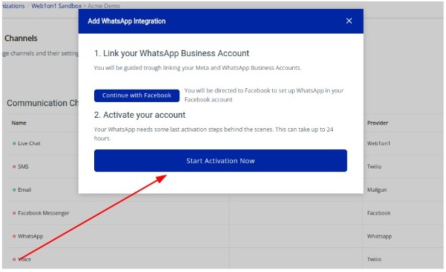 Step-by-step guide to activating a WhatsApp Business Account (WABA) in CitNOW Conversations/Web1on1 automotive messaging platform
